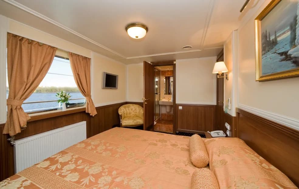 Эти каюты — самый роскошный и престижный выбор. Чаще всего расположены только на верхних палубах. Имеют балкон с видом на реку, где можно проводить время на свежем воздухе. Это самые просторные и комфортные каюты, но и цены у них соответствуют.